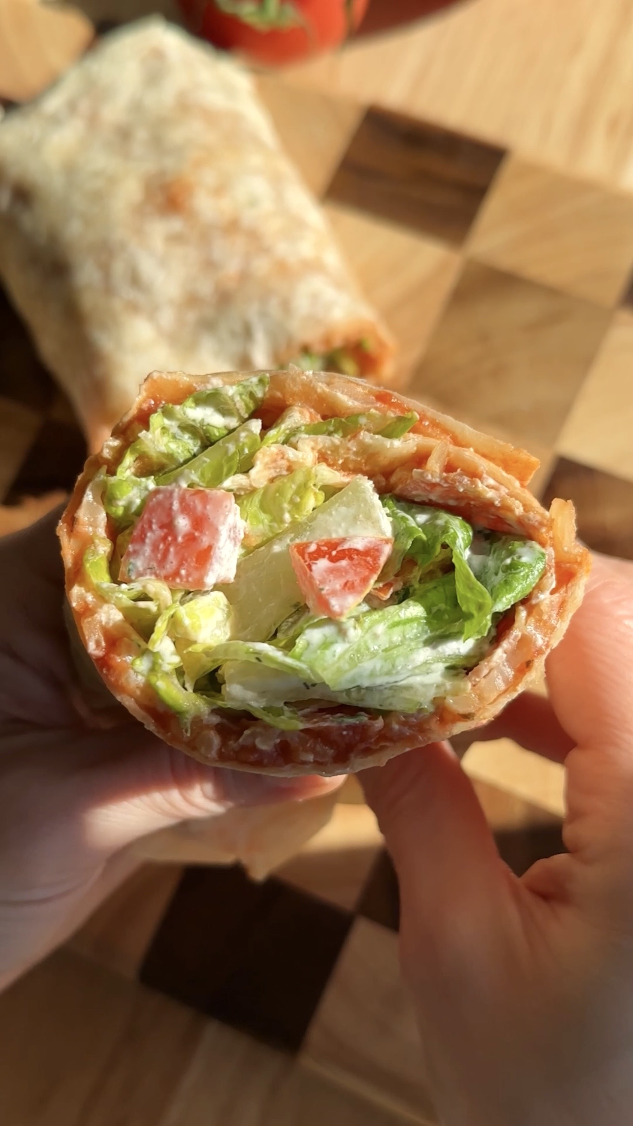 - Spoon the ranch-dressed salad down the center of the warm pizza-topped tortilla. Gently fold in the sides, then roll it up, tucking the filling in. Slice in half, and serve while it’s still warm and melty. Enjoy!